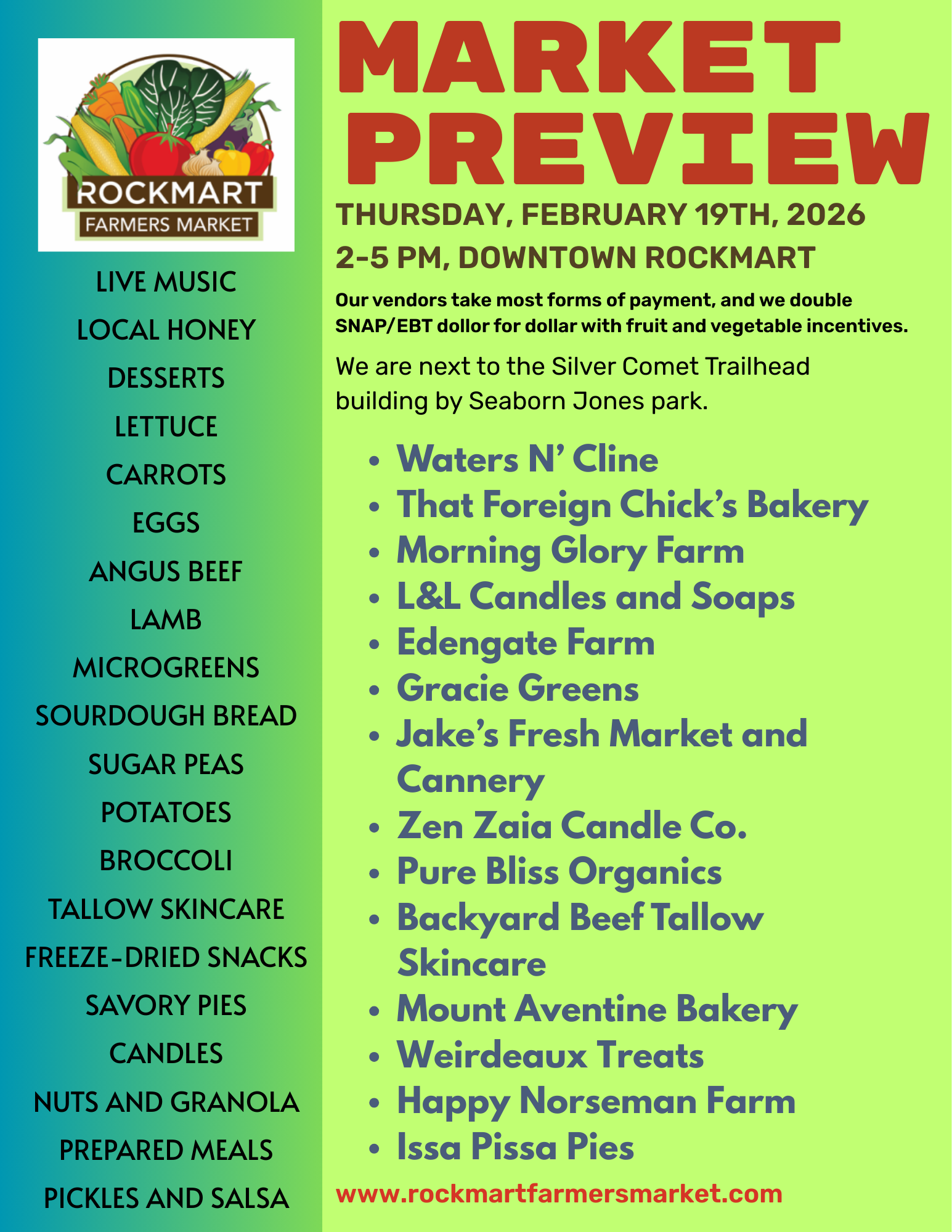 It's a special market this week! We are welcoming a new vendor: ISSA PISSA PIES and we will enjoy live music with WATERS N' CLINE. Come enjoy shopping in the park, 2-5pm in downtown Rockmart